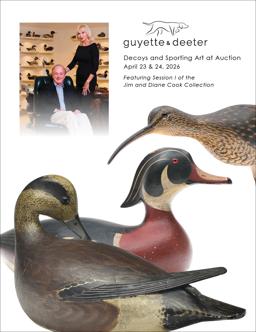 Established in 1984, Guyette & Deeter, Inc. has held over 130 live auctions, realizing over $290 million in sales of decoys, paintings, firearms, folk art and related sporting items. Our firm has handled the most important decoys and collections in North America and we have set nearly all of the world records in these categories: duck and shorebird decoys, fish decoys and plaques, duck calls and crow calls, decorative carvings, shotgun shell boxes, salesman sample canoes, and other related items.