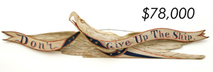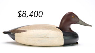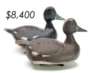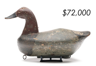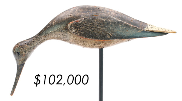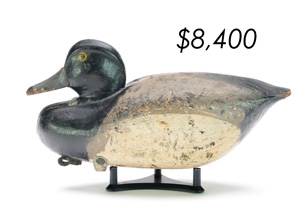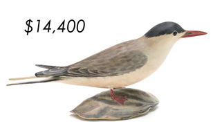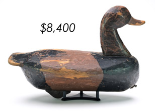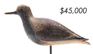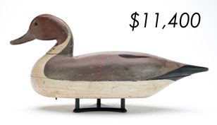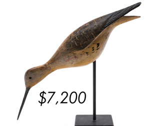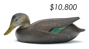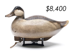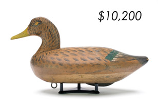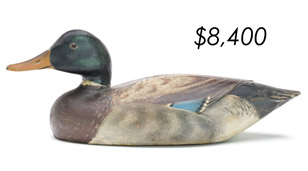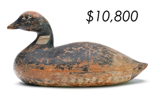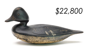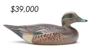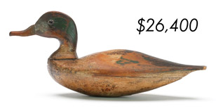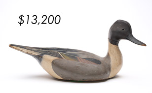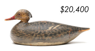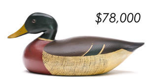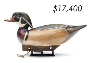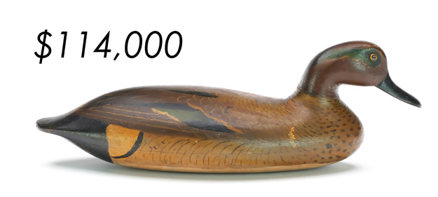 The top lot in the sale was a low-head pintail drake in the “beaver tail” style by the Ward Brothers of Crisfield, Maryland. Finishing at $264,000, the rare decoy set a new high-water mark for the artist’s work. A fresh to the market, 19th century bufflehead by Nathan Cobb Jr of Virginia brought $204,000. Two decorative carvings by Elmer Crowell topped $100,000 with an impressive curlew at $114,000 and an extremely rare ruddy turnstone at $102,000.