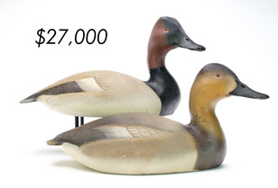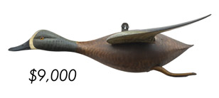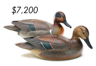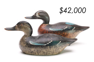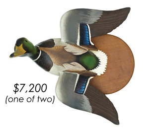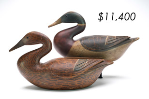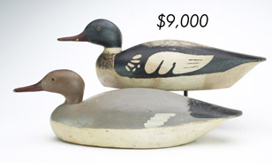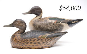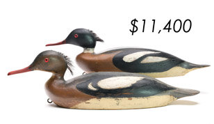 ![]() World Auction Record for Makers Beaver tail style pintail, Ward Brothers | ![]() Pair of American mergansers, John Dawson |