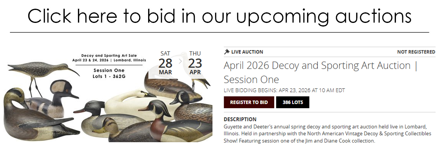 Established in 1984, Guyette & Deeter, Inc. has held over 130 live auctions, realizing over $290 million in sales of decoys, paintings, firearms, folk art and related sporting items. Our firm has handled the most important decoys and collections in North America and we have set nearly all of the world records in these categories: duck and shorebird decoys, fish decoys and plaques, duck calls and crow calls, decorative carvings, shotgun shell boxes, salesman sample canoes, and other related items.