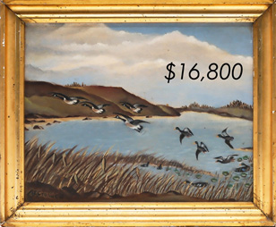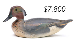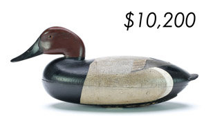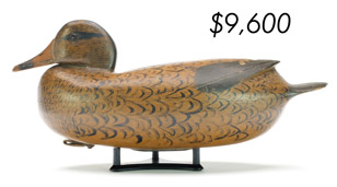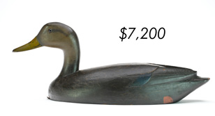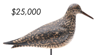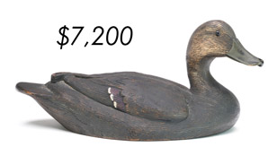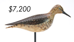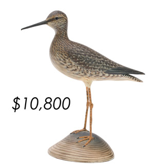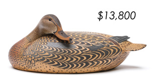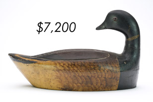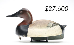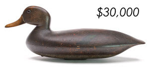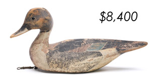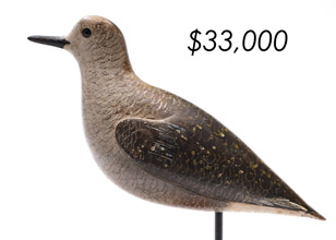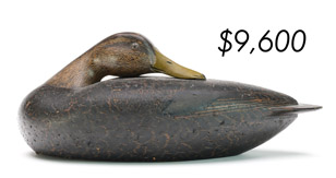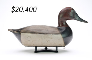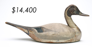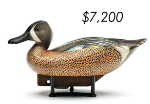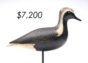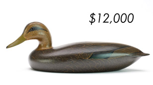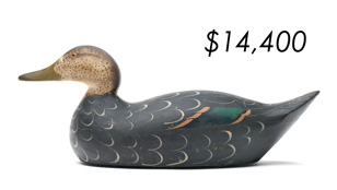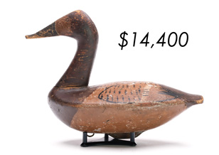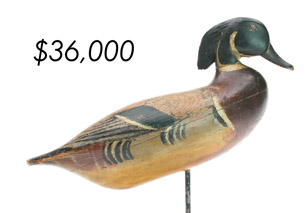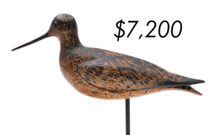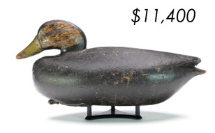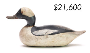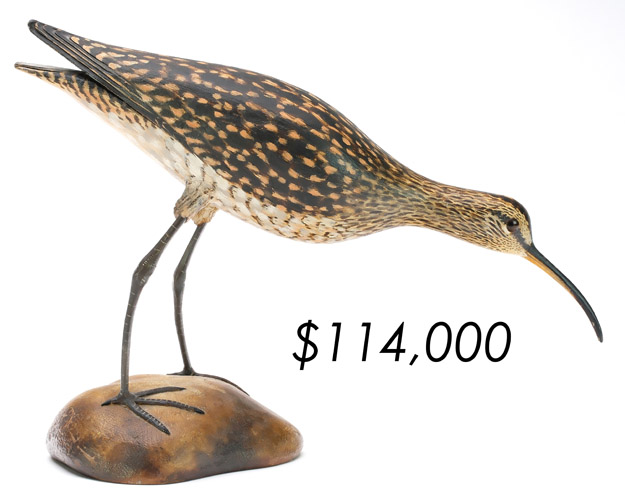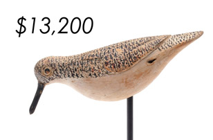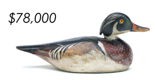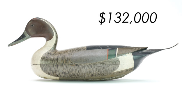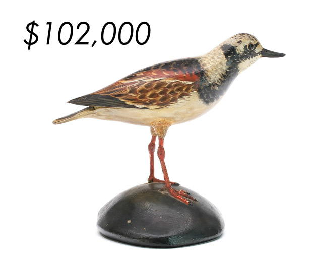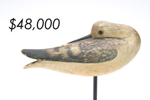 The top lot in the sale was a low-head pintail drake in the “beaver tail” style by the Ward Brothers of Crisfield, Maryland. Finishing at $264,000, the rare decoy set a new high-water mark for the artist’s work. A fresh to the market, 19th century bufflehead by Nathan Cobb Jr of Virginia brought $204,000. Two decorative carvings by Elmer Crowell topped $100,000 with an impressive curlew at $114,000 and an extremely rare ruddy turnstone at $102,000.