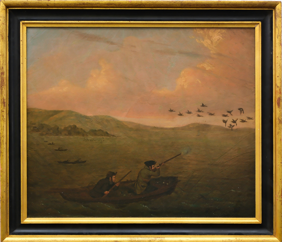 Early oil on canvas depicting 'line shooting' in Massachusetts